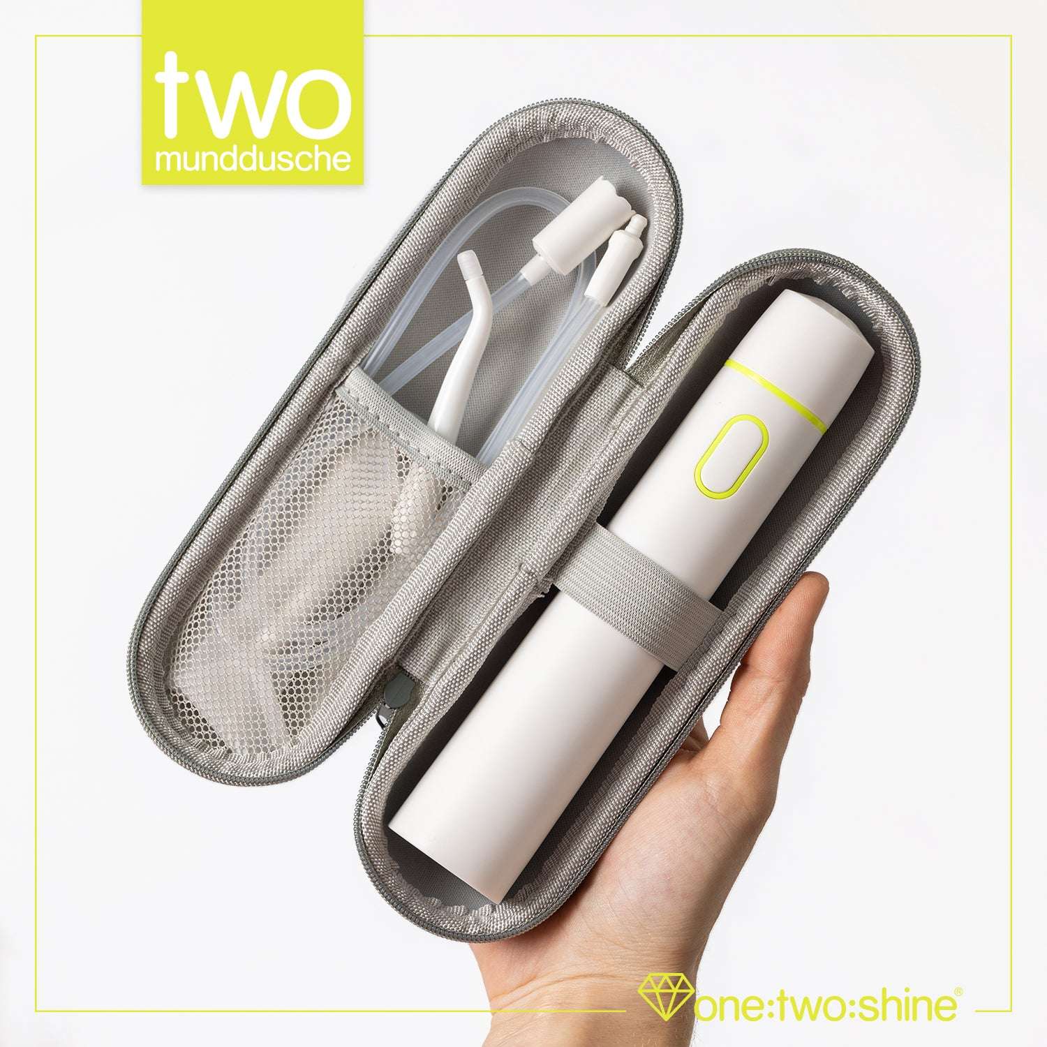 Wenn man an elektrische Mundduschen denkt, haben viele Menschen direkt ein sperriges Gerät mit Wassertank im Kopf, das unnötig Platz im Bad wegnimmt. Doch bei One:two:shine haben wir Produkte für die Zahnpflege entwickelt, die nicht nur effizient reinigen, sondern auch praktisch und kompakt sind. Unsere Munddusche TWO besticht durch ihr elegantes und modernes Design in Lime-Green oder Hot-Pink und kommt ganz ohne Wasserbehälter aus! Durch die hygienische Wasserzuleitung aus einem Wasserglas oder Behälter können sich keine Bakterien ansammeln und du kannst auf lästiges Säubern verzichten. Zusammen mit ihrem bärenstarken Akku, der mehrere Wochen hält und dem stilvollen Reise-Etui, kannst du unsere Munddusche problemlos überallhin mitnehmen. Die weiche Silikon-Düse liegt bequem im Mund und die zwei Reinigungsmodi passen sich individuell deinen Bedürfnissen an. So werden alle schwer zugänglichen Zahnzwischenräume gereinigt und Essensreste gründlich entfernt. Auch für Träger von Implantaten, Zahnspangen und Prothesen sind elektrische Mundduschen echte Gamechanger.